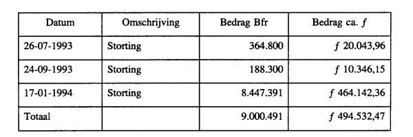 Ook op 31 juli 1995 vindt er op die rekening een storting plaats van Bfr 241.150 zodat totaal werd gestort Bfr 5.725.150 of in guldens f 314.500.