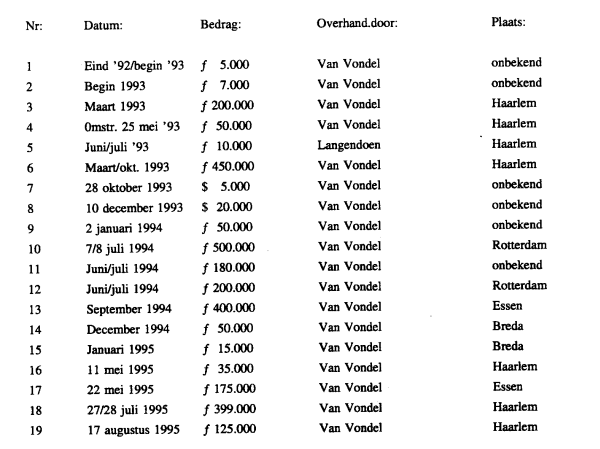 Haarlem. Tijdens die gesprekken gaf Sapman aan op welke wijze hij het ontvangen geld geïnvesteerd had. Ook werd bij deze gesprekken door Sapman een schriftelijke verantwoording afgelegd. Deze verantwoording, zo had van Vondel tegen Sapman gezegd, was nodig voor de boekhouder. Na zo'n gesprek verlieten Van Vondel en Sapman de bar en werd buiten het hotel door Van Vondel het geld overgedragen aan Sapman. Langendoen was bij het overhandigen van het geld niet aanwezig.