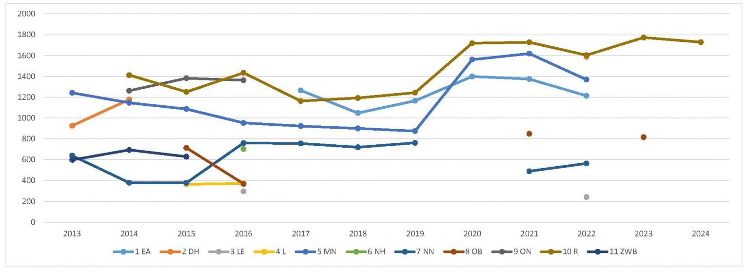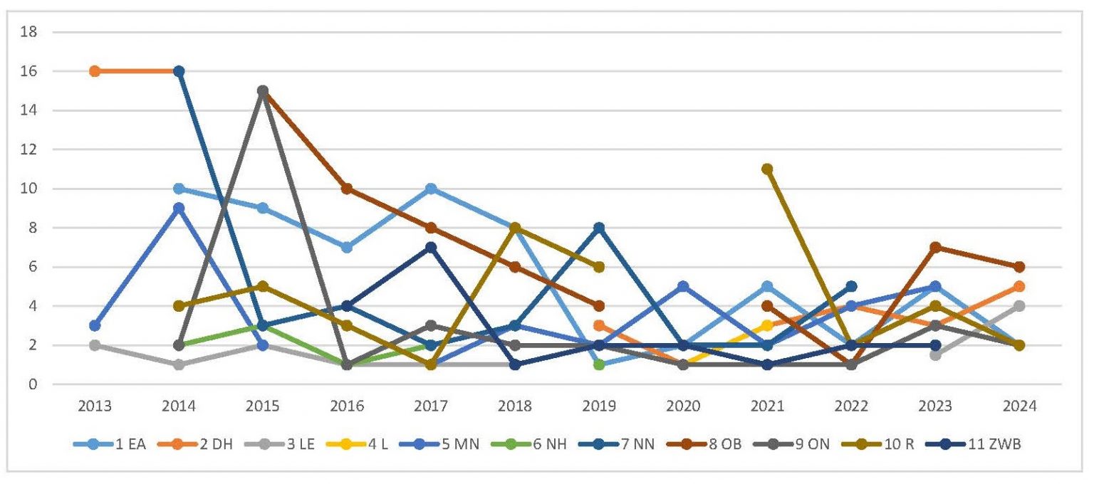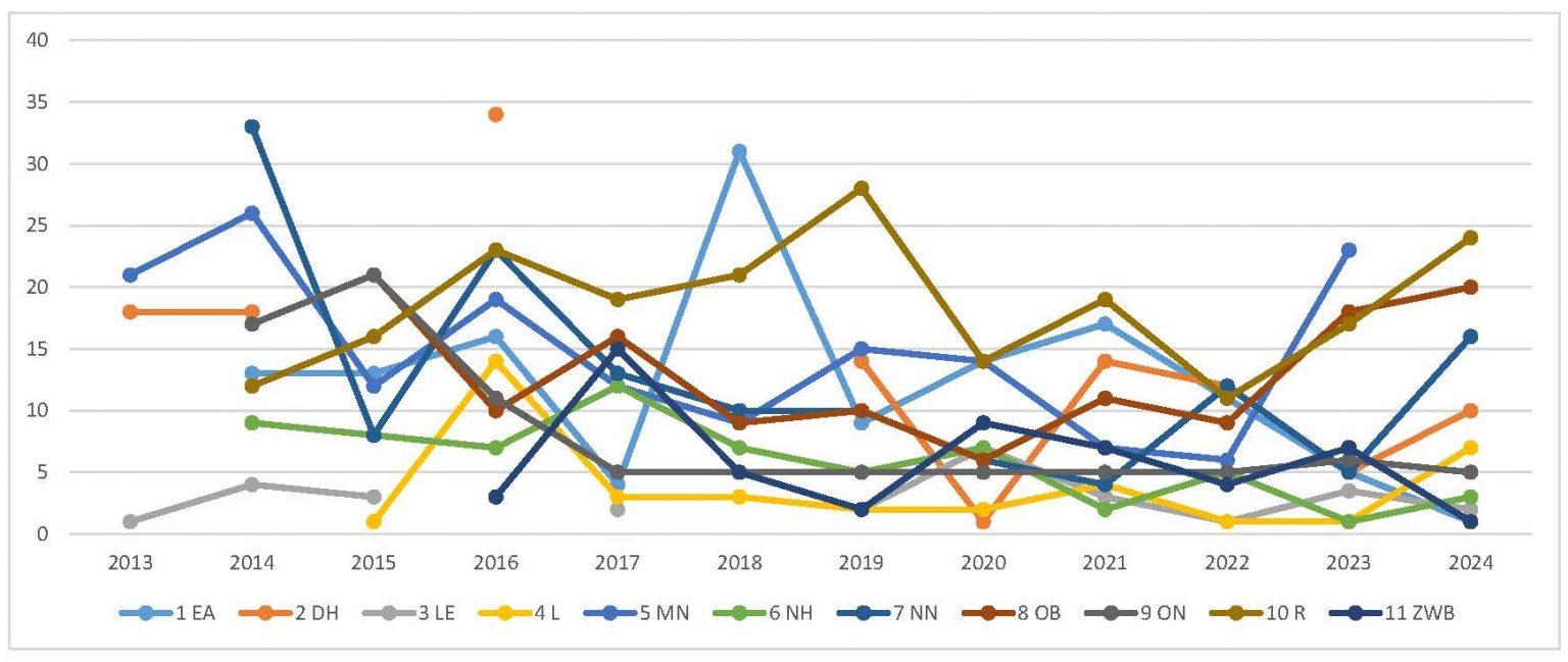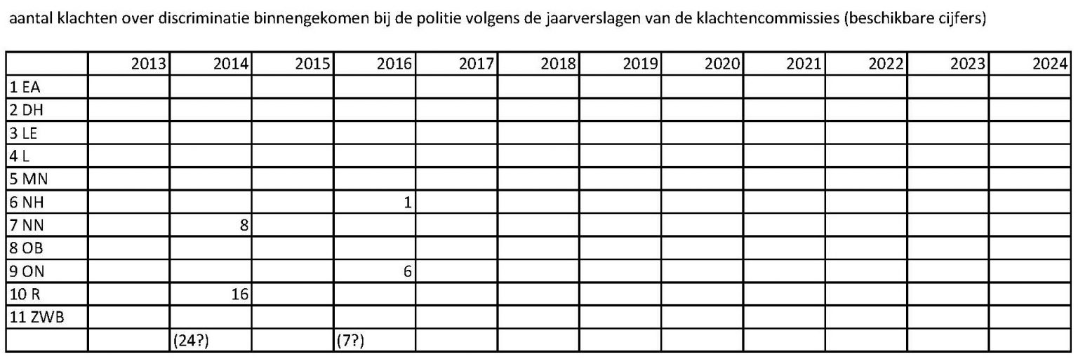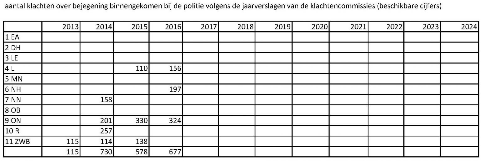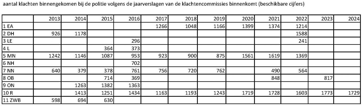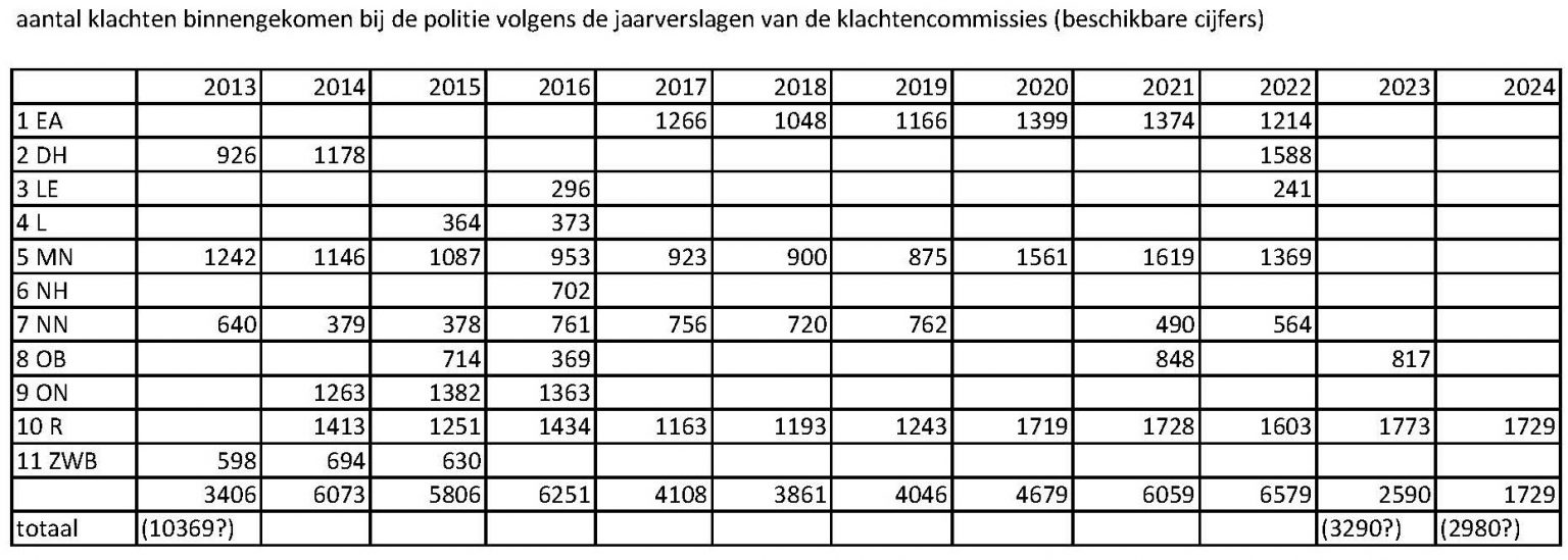 In de elf jaar die zijn onderzocht is dit de enige keer dat er een totaalcijfer is gepubliceerd, al moet gezegd worden dat het onduidelijk is waarop dit cijfer is gebaseerd, omdat de cijfers van zeven politie-eenheden niet is verstrekt. In 2024 schreef de voorzitter van de klachtencommissie van Oost-Brabant, Mr C.J.G.M. (Kees) van der Weide, dat er in 2023 3.290 en in 2024 2.980 landelijk door de politie zijn afgedaan. Waar rechter van der Weide deze cijfers op baseert is niet duidelijk. In 2023 publiceerden twee regio’s het aantal klachten en in 2024 één regio. In 2023 was het aantal van die twee regio’s Rotterdam en Oost-Brabant, 2.590 en zouden de andere negen regio’s slechts 700 klachten hebben ontvangen en in 2024 zouden de tien regio’s naast Rotterdam minder klachten ontvangen (1.251) dan Rotterdam zelf.