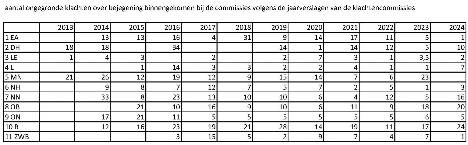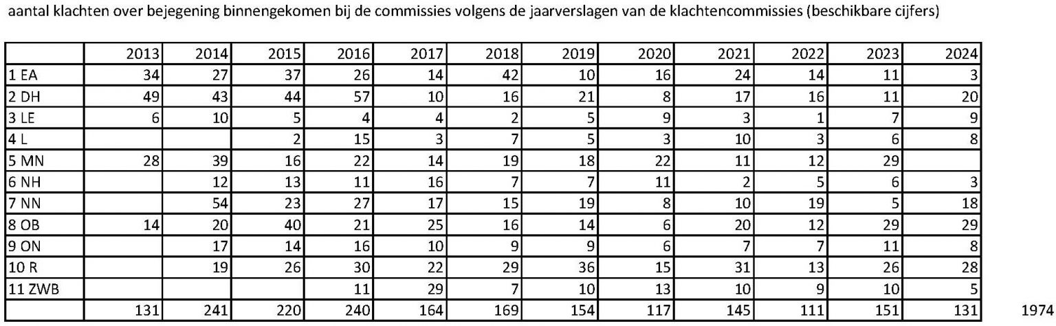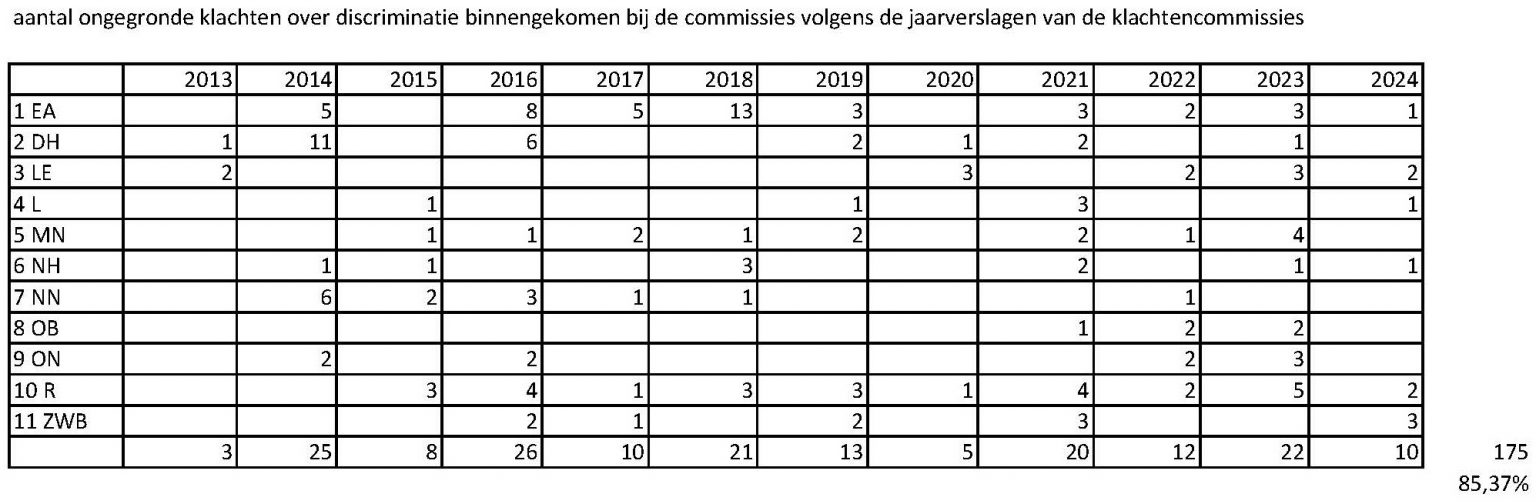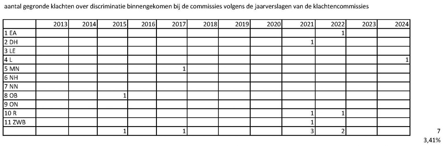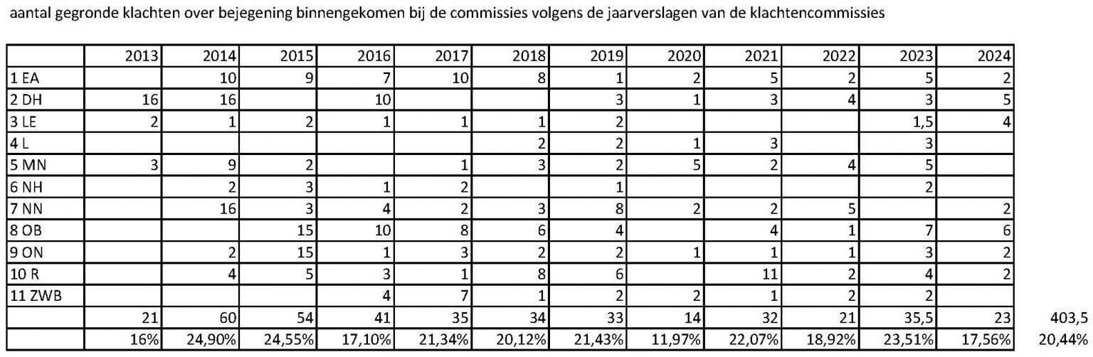 Nog ontbrekende cijfers: aantal klachten binnengekomen bij de klachtencommissies, totalen gegrond en ongegrond, andere klachten dan bejegening en discriminatie, duur procedure en leden van de commissies.