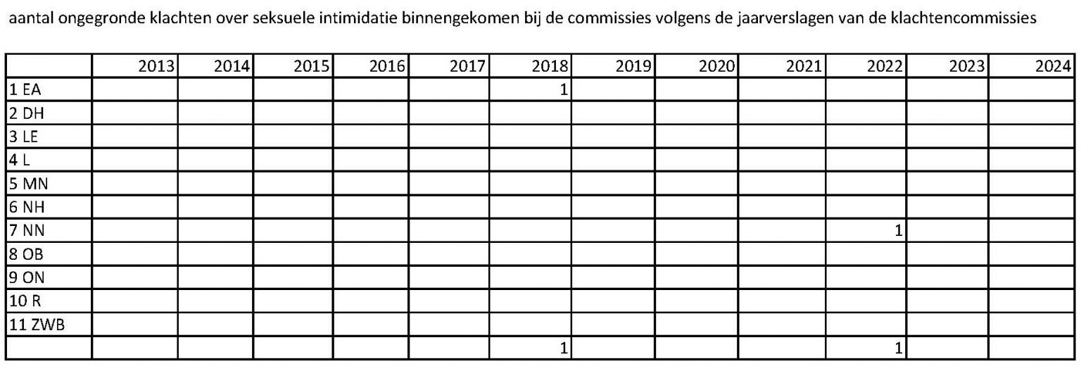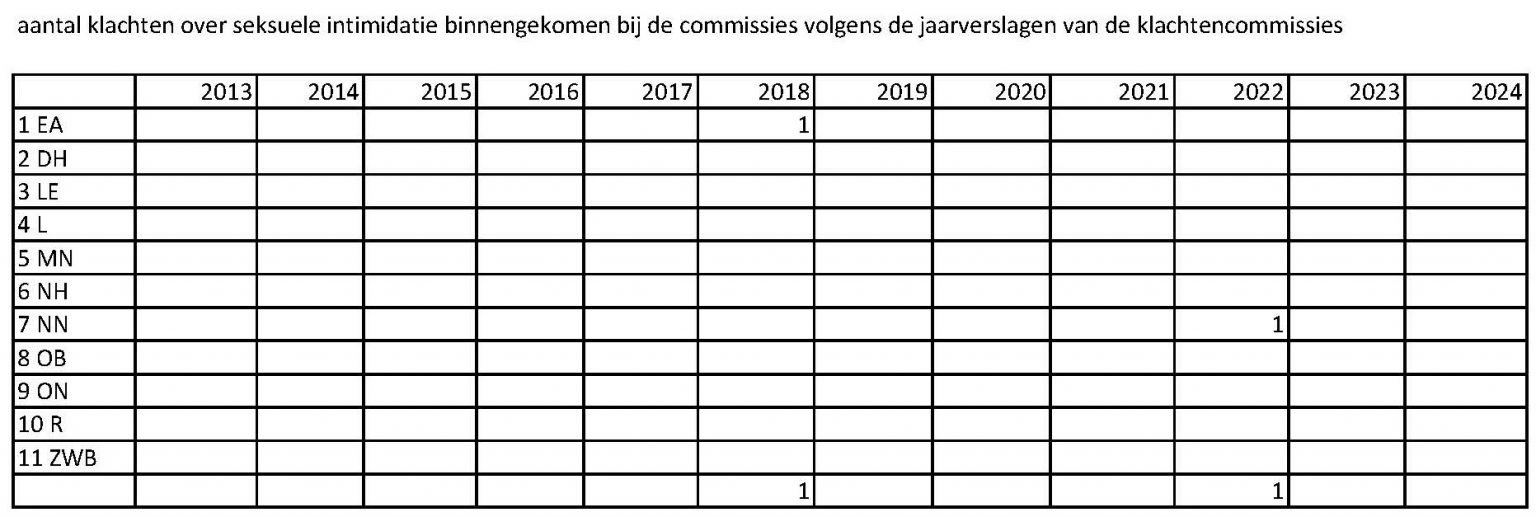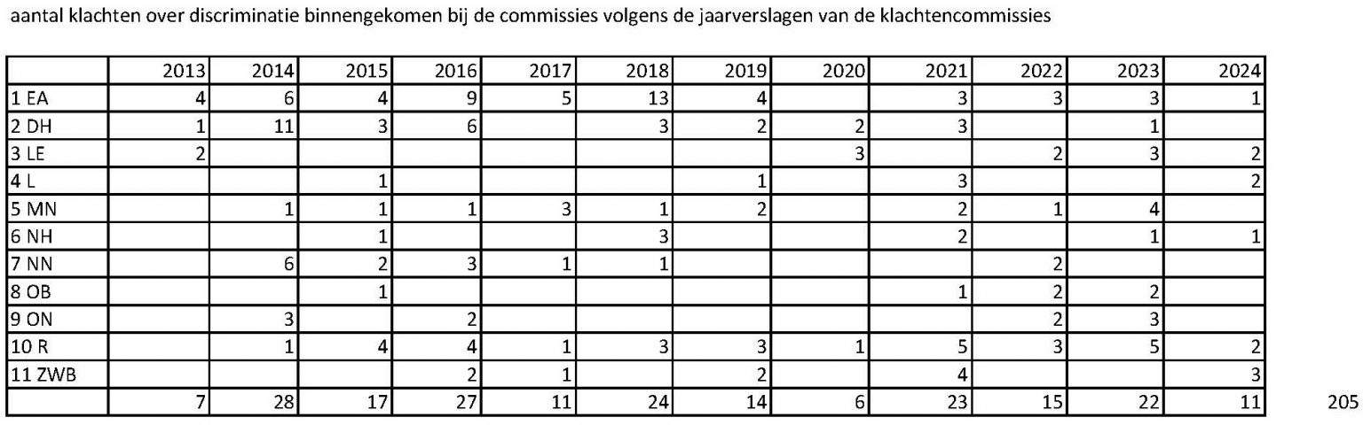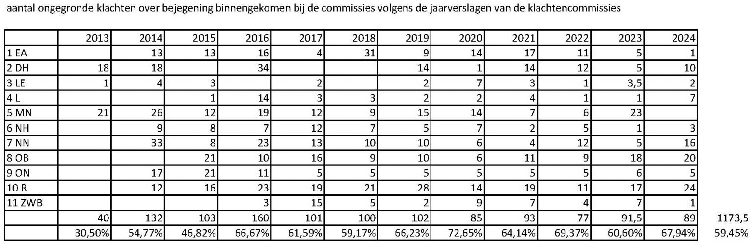 Nog ontbrekende cijfers: aantal klachten binnengekomen bij de klachtencommissies, totalen gegrond en ongegrond, andere klachten dan bejegening en discriminatie, duur procedure en leden van de commissies.