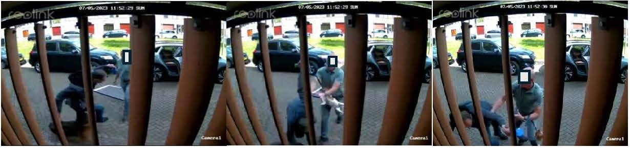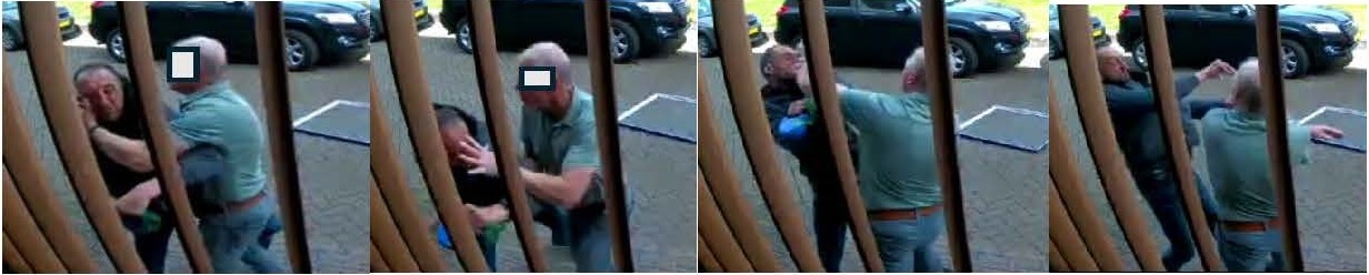 NN1 plaatst de rechterknie ter hoogte van het borstbeen van NN2, die nu met z’n rug op de grond ligt. NN1 blijft doorgaan met het maken van stompende bewegingen, zes (6) keer, met z’n linker gebalde vuist in de richting van het gezicht van NN2. Dit gebeurt met kracht. Niet waarneembaar waar NN2 precies geraakt wordt maar zeer vermoedelijk op zijn hoofd. NN2 probeert met behulp van gestrekte arm NN1 op afstand te houden. Met deze gestrekte linkerarm duwt NN2 NN1 ter hoogte van de rechterschouder.