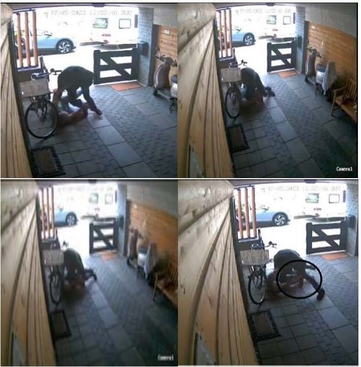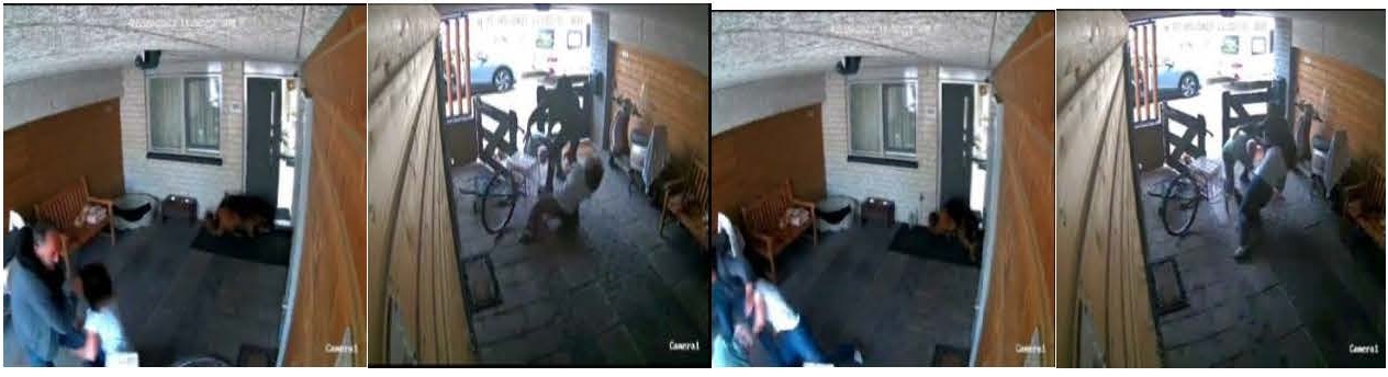 Kijkt u naar onderstaande beelden. Let daarbij op de weergegeven tijden in beeld. Om 11.52.46 viel ik. Ik sta ook direct weer op. U ziet linksboven dat Diana S. 11.52.47 de deur uitkomt. U ziet dat ik overeind kom, nergens stompende bewegingen maak en alweer sta, vóórdat Diana S. (11.52.48) bij me is. Net zoals politieagent Henri R., blijkt ook politieagent Diana S. aan hallucinaties te lijden of gewoon te liegen.