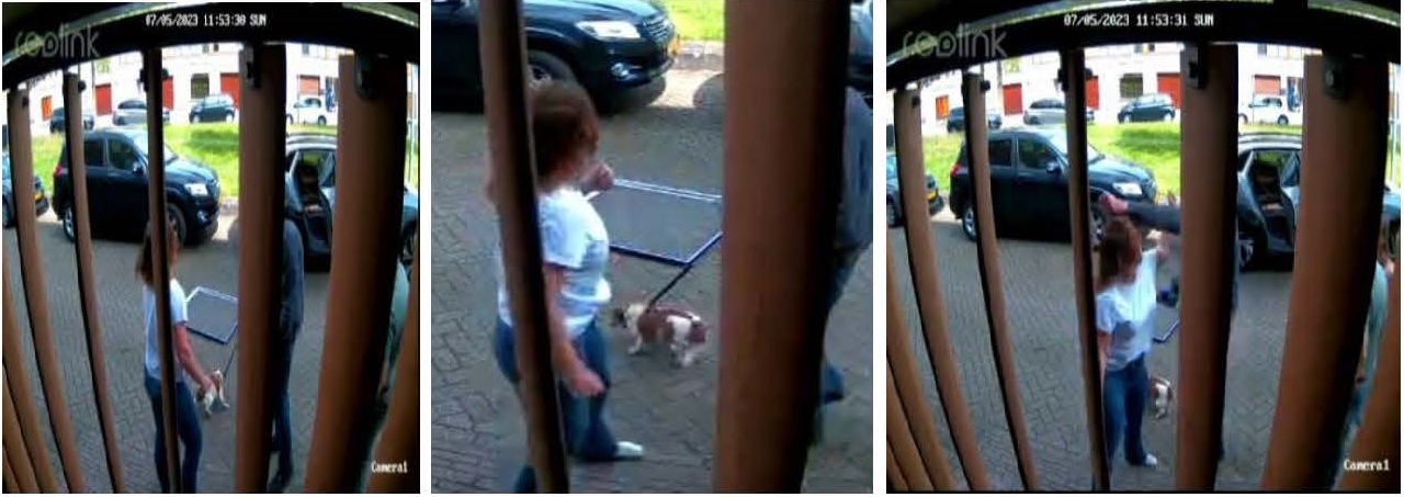Vanuit het niets word ik aangevlogen door de Herder van Diana S. en Jan Jaap de L. In het camerabeeldverslag (CBV) van de politie, vervaardigt door Henri R., wordt vermeld dat ik de herder meerdere keren zou hebben getrapt. Onjuist. Zie bovenstaande beelden.