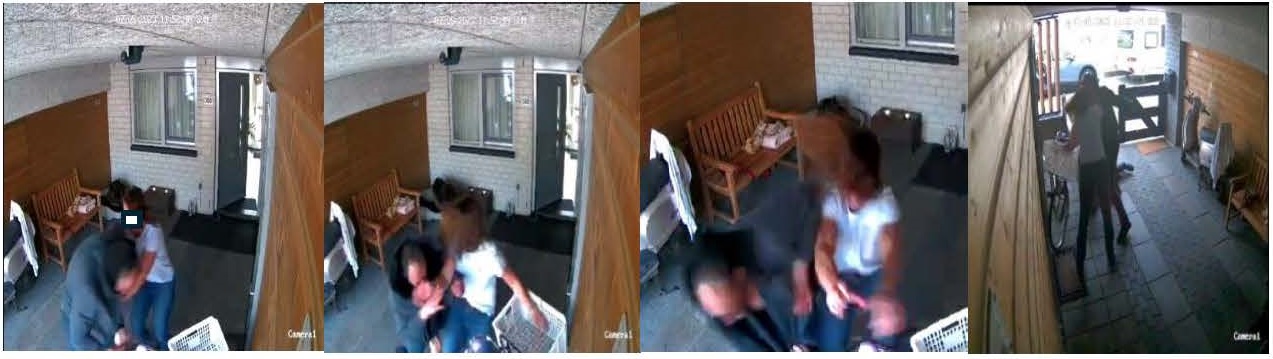 Heel veel beelden, waarop ik fors mishandeld werd ontbreken in het camerabeeldverslag. De context wordt met regelmaat verdraaid, zodat het lijkt dat ik ergens begin. Ook waar Diana S. op mijn hondje trapt, terwijl ze me met drie personen aanvielen. Niet terug te zien. De politie heeft dat allemaal toegedekt. Een voorbeeld daarvan hieronder.